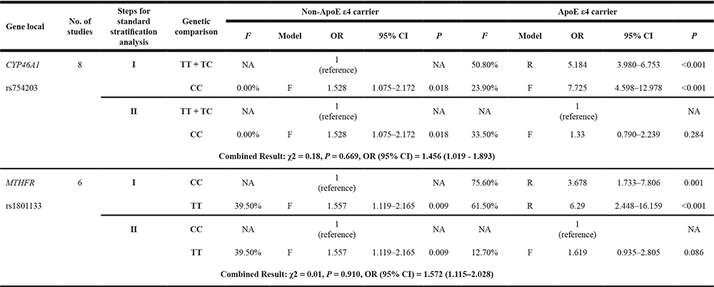 Note: OR: odds ratio; CI: confidence interval; F: fixed-effect model; R: random-effect model; NA: not available; I: factorial stratification analysis; II: confounder-controlling stratification analysis; CYP46A1: cholesterol-24 S-hydroxylase; ApoE ε4: the ε4 allele of the apolipoprotein E gene; MTHFR: methylenetetrahydrofolate reductase.
