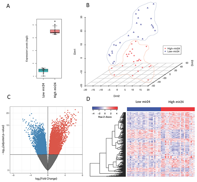 For both data sets, wald test p values and adjusted p values provided by DESeq2 package were used for differential expression analysis (adjusted p < 0.1) which is based on estimating dispersions and uses a negative binomial generalized linear model. For sample clustering, we performed a classical multidimensional scaling or Principal Component Analysis (PCA), t-distributed stochastic neighbor embedding (t-SNE) and a Euclidean distance based clustering. We used ANOVA and MANOVA to examine the association of mir-24-3p with known prognostic factors, i.e. subtype, grade, stage and survival time. For pathway and enrichment analysis, we used hypergeometric distribution tests performed by clusterProfiler package (adjusted p < 0.1). The data in both data sets were individually and comprehensively analyzed and visualized all in the R statistical environment (v3.2.5). The Cox proportional hazards model was used to assess the association of subtype, stage, and mir-24-3p with survival in the TCGA dataset. The log-rank test was also used for testing the survival rates and distributions.