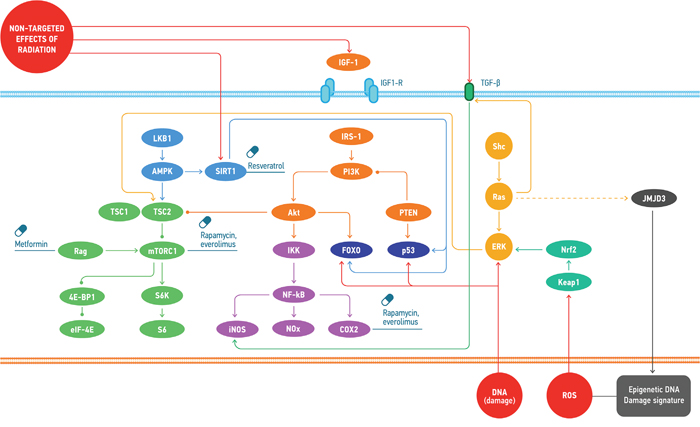 Figure 4: Common molecular mechanisms involved in the response to the effects of space radiation and the geroprotectors affecting the regulation of those. Space radiation induces cellular response through the direct DNA damage, ROS accumulation and non-targeted effects. These types of damage provoke distinct signalling mechanisms that may be regulated by the small molecules.