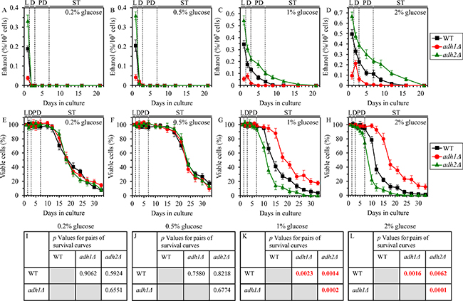 Figure 1: Effects of the adh1Δ and adh2Δ mutations on ethanol concentration and CLS under CR and non-CR conditions. WT, adh1Δ and adh2Δ cells were cultured in the nutrient-rich YP medium under CR (the initial concentration of glucose was 0.2% or 0.5%) or non-CR (the initial concentration of glucose was 1% or 2%) conditions. (A–D) Ethanol concentrations in yeast cultures grown under CR or non-CR conditions and recovered on different days of culturing. (E–H) Survival curves of chronologically aging WT, adh1Δ and adh2Δ strains. Data are presented as means ± SEM (n = 4). (I–L) p Values for different pairs of survival curves of WT, adh1Δ and adh2Δ strains cultured under CR or non-CR conditions. Survival curves shown in (E–H) were compared. Two survival curves were considered statistically different if the p value was less than 0.05. The p values for comparing pairs of survival curves using the logrank test were calculated as described in “Materials and Methods”. Abbreviations: L, D, PD and ST, logarithmic, diauxic, post-diauxic and stationary growth phases (respectively).