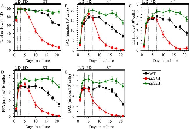 Figure 3: Effects of the adh1Δ and adh2Δ mutations on the abundance of LD, TAG, EE, FFA and DAG in non-CR yeast. WT, adh1Δ and adh2Δ cells were cultured in the nutrient-rich YP medium under non-CR conditions on 2% glucose. The percentage of cells with LD (A) as well as TAG (B), EE (C), FFA (D) and DAG (E) concentrations in whole cells recovered on different days of culturing are shown. The abundance of LD and the concentrations of TAG, EE, FFA and DAG in whole cells were measured as described in “Materials and Methods”. Abbreviations: DAG, diacylglycerols; EE, ergosteryl esters; FFA, free fatty acids; LD, lipid droplets; L, D, PD and ST, logarithmic, diauxic, post-diauxic and stationary growth phases (respectively); TAG, triacylglycerols.