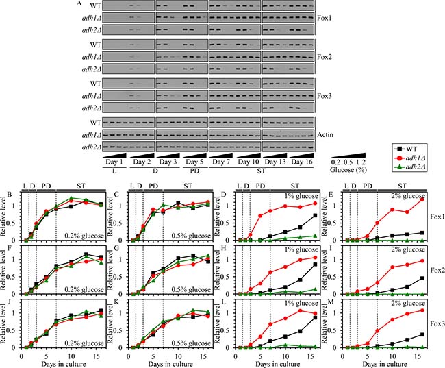 Figure 4: Effects of the adh1Δ and adh2Δ mutations on the concentrations of Fox1, Fox2 and Fox3 in yeast cultured under CR or non-CR conditions. WT, adh1Δ and adh2Δ cells were cultured in the nutrient-rich YP medium under CR (the initial concentration of glucose was 0.2% or 0.5%) or non-CR (the initial concentration of glucose was 1% or 2%) conditions. (A) Western blot analysis of Fox1, Fox2, Fox3 and actin in total cell lysates was performed as described in “Materials and Methods”. (B–M) Immunoblots shown in (A) were used to calculate the relative levels of Fox1, Fox2 and Fox3 in total cell lysates as described in “Materials and Methods”. Abbreviations: L, D, PD and ST, logarithmic, diauxic, post-diauxic and stationary growth phases (respectively).