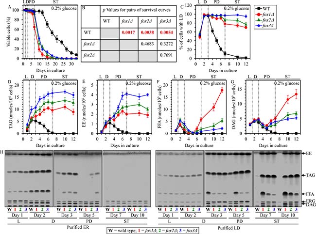 Figure 5: Effects of the fox1Δ, fox2Δ and fox3Δ mutations on CLS, LD abundance, and TAG, EE, FFA and DAG concentrations in yeast cultured under CR conditions. WT, fox1Δ, fox2Δ and fox3Δ cells were cultured in the nutrient-rich YP medium under CR conditions on 0.2% glucose. (A) Survival curves of chronologically aging WT, fox1Δ, fox2Δ and fox3Δ strains. Data are presented as means ± SEM (n = 4). (B) p Values for different pairs of survival curves of WT, fox1Δ, fox2Δ and fox3Δ strains. Survival curves shown in (A) were compared. Two survival curves were considered statistically different if the p value was less than 0.05. The p values for comparing pairs of survival curves using the logrank test were calculated as described in “Materials and Methods”. The percentage of cells with LD (C) as well as TAG (D), EE (E), FFA (F) and DAG (G) concentrations in whole cells recovered on different days of culturing are shown. Data are presented as means ± SEM (n = 4). The abundance of LD and the concentrations of TAG, EE, FFA and DAG in whole cells were measured as described in “Materials and Methods”. (H) Spectra of lipids that were extracted from the ER or LD purified from WT, fox1Δ, fox2Δ and fox3Δ cells. Cells were recovered on different days of culturing, and the ER and LD were purified as described in “Materials and Methods”. The equivalent of 200 μg of ER proteins and the equivalent of 20 μg of LD proteins were used for lipid extraction and analysis by thin-layer chromatography, as described in “Materials and Methods”. A representative of 3 independent experiments is shown. Abbreviations: DAG, diacylglycerols; EE, ergosteryl esters; ER, endoplasmic reticulum; FFA, free fatty acids; LD, lipid droplets; L, D, PD and ST, logarithmic, diauxic, post-diauxic and stationary growth phases (respectively); TAG, triacylglycerols.