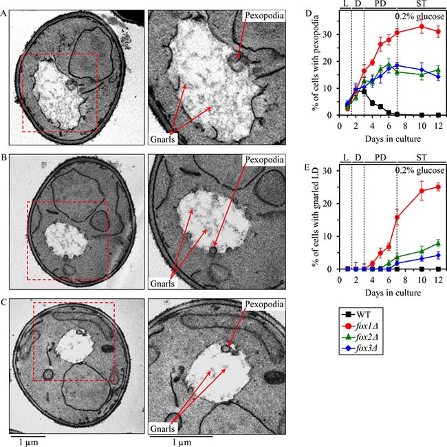 We have used electron microscopy to monitor age-related changes in the abundance of pexopodia and LD-confined gnarls in WT, fox1Δ, fox2Δ and fox3Δ cells cultured under CR on 0.2% glucose.