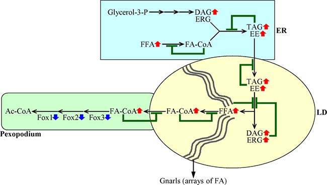 In sum, these findings suggest that a decline in the peroxisomal β-oxidation of FFA causes a build-up of fatty acyl-CoA esters (FA-CoA) in pexopodia, which represent intrusions of peroxisomes into the neutral lipid core of LD. This creates a negative feedback loop which mitigates the transport of FA-CoA to pexopodia from associated LD, where these FA-CoA are formed from FFA derived from neutral lipids (Figure 7). This, in turn, elicits an accumulation of gnarls (the electron-dense arrays of FFA [25]) in LD, thereby instigating a series of negative feedback loops. These feedback loops attenuate the lipolysis of neutral lipids in LD, transport of neutral lipids from the ER to LD, and synthesis of neutral lipids synthesis from FFA, DAG and ERG in the ER (Figure 7). Due to the action of such negative feedback mechanism regulating lipid metabolism and transport in several organelles, a decline in peroxisomal fatty acid β-oxidation in chronologically aging yeast causes an age-related build-up of FFA and DAG in the ER and LD (Figure 7).