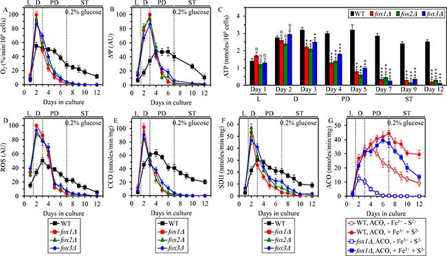 Figure 8: Effects of the fox1Δ, fox2Δ and fox3Δ mutations on vital traits of mitochondrial functionality, including ATP synthesis, in yeast cultured under CR conditions. WT, fox1Δ, fox2Δ and fox3Δ cells were cultured in the nutrient-rich YP medium under CR conditions on 0.2% glucose. The rate of oxygen consumption by cells (A), electrochemical potential (ΔΨ) across the IMM (B), cellular ATP concentration (C), cellular ROS concentration (D), enzymatic activity of cytochrome c oxidase (CCO) in purified mitochondria (E), enzymatic activity of succinate dehydrogenase in purified mitochondria (SDH) (F), and enzymatic activity of aconitase (ACO) in total cell lysates (G) were measured as described in “Materials and Methods”. The ACO activity was measured with or without the reactivation agents Fe3+ and Na2S. Data are presented as means ± SEM (n = 5 for (A); n = 3 for (B–G); ns, not significant; ** < 0.01; *** < 0.001). Abbreviations: L, D, PD and ST, logarithmic, diauxic, post-diauxic and stationary growth phases (respectively); IMM, inner mitochondrial membrane; ROS, reactive oxygen species.