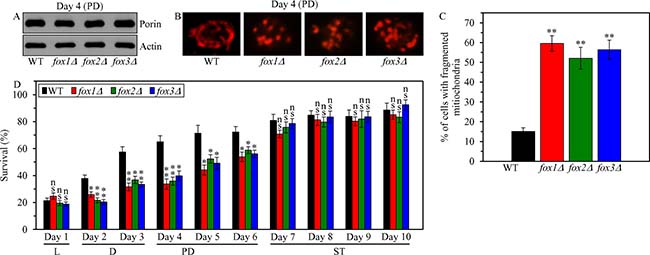 Figure 9: Effects of the fox1Δ, fox2Δ and fox3Δ mutations on mitochondrial abundance and morphology, and on cell susceptibility to mitochondria-controlled apoptotic RCD in yeast cultured under CR conditions. WT, fox1Δ, fox2Δ and fox3Δ cells were cultured in the nutrient-rich YP medium under CR conditions on 0.2% glucose. (A) The concentrations of porin and actin in total cell lysates were assessed by immunoblotting, as described in “Materials and Methods”. (B) Mitochondrial morphology was visualized with the help of indirect immunofluorescence microscopy using primary antibodies against porin, as described in “Materials and Methods”. (C) The percentage of cells exhibiting fragmented mitochondria was calculated. At least 500 cells of each strain were used for quantitation. Data are presented as means ± SEM (n = 3; ** < 0.01). (D) An assay for measuring clonogenic survival of cells treated for 2 h with 2.5 mM hydrogen peroxide was performed as described in “Materials and Methods”. Data are presented as means ± SEM (n = 3; ns, not significant; * < 0.05; ** < 0.01). Abbreviations: L, D, PD and ST, logarithmic, diauxic, post-diauxic and stationary growth phases (respectively).