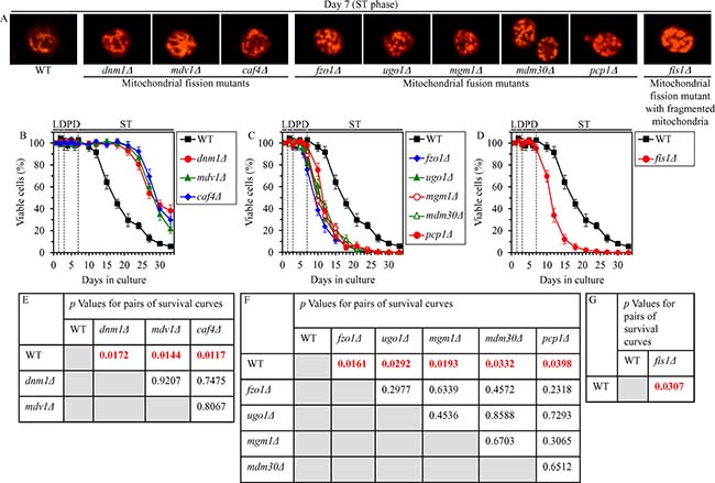 Figure 10: Effects of the single-gene-deletion mutations eliminating different protein components of the mitochondrial fission or fusion machine on mitochondrial morphology and CLS in yeast cultured under CR conditions. WT, dnm1Δ, mdv1Δ, caf4Δ, fzo1Δ, ugo1Δ, mgm1Δ, mdm30Δ, pcp1Δ and fis1Δ cells were cultured in the nutrient-rich YP medium under CR conditions on 0.2% glucose. (A) Mitochondrial morphology was visualized with the help of indirect immunofluorescence microscopy using primary antibodies against porin, as described in “Materials and Methods”. (B–D) Survival curves of chronologically aging WT and mutant cells. Data are presented as means ± SEM (n = 3). (E–G) p Values for different pairs of survival curves of WT and mutant strains. Survival curves shown in (B–D) were compared. Two survival curves were considered statistically different if the p value was less than 0.05. The p values for comparing pairs of survival curves using the logrank test were calculated as described in “Materials and Methods”. Abbreviations: L, D, PD and ST, logarithmic, diauxic, post-diauxic and stationary growth phases (respectively).