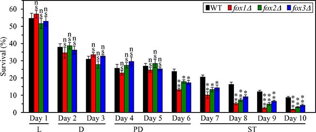 Figure 11: Effects of the fox1Δ, fox2Δ and fox3Δ mutations on cell susceptibility to liponecrotic RCD in yeast cultured under CR conditions. WT, fox1Δ, fox2Δ and fox3Δ cells were cultured in the nutrient-rich YP medium under CR conditions on 0.2% glucose. An assay for measuring clonogenic survival of cells treated for 2 h with 0.15 mM palmitoleic acid, a monounsaturated FFA, was performed as described in “Materials and Methods”. Data are presented as means ± SEM (n = 3; ns, not significant; * < 0.05; ** < 0.01; *** < 0.001). Abbreviations: L, D, PD and ST, logarithmic, diauxic, post-diauxic and stationary growth phases (respectively).