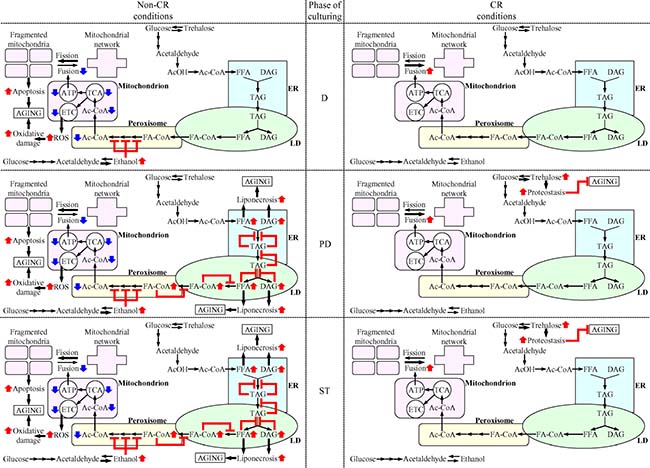 The model posits that CR orchestrates the development and maintenance of an aging-delaying cellular pattern throughout yeast chronological lifespan, before an arrest of cell growth and division (i.e. during D and PD phases of culturing) and after such arrest (i.e. during ST phase of culturing) (Figure 13). CR elicits the stepwise development and maintenance of this cellular pattern by modulating a network that integrates the following: 1) pathways of ethanol, trehalose and lipid metabolism; 2) interorganellar communications involving unidirectional and bidirectional movements of certain metabolites between the ER and the cytosol, the ER and LD, LD and peroxisomes, and peroxisomes and mitochondria; and 3) a balance between the processes of mitochondrial fission and fusion (Figure 13). These CR-driven patterns of metabolism, interorganellar communications and mitochondrial morphology delay the age-related onsets of apoptotic and liponecrotic modes of RCD throughout different stages of chronological aging (Figure 13). Moreover, CR lowers the concentration of mitochondrially produced ROS and rises trehalose concentration, thereby preserving cellular proteostasis and actively increasing the chance of survival. Because CR decreases the risk of cell death and actively increases the chance of cell survival throughout chronological lifespan (i.e. during D, PD and ST phases of culturing), this low-calorie diet extends yeast CLS.