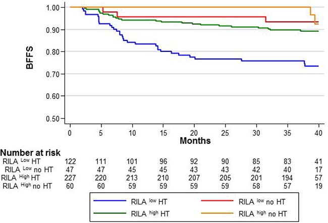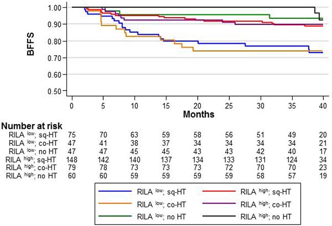 Figure 3: BFFS according to the RILA score (RILALOW or RILAHIGH) and HT timing relative to radiotherapy: concomitant “co-HT”, sequential “sq-HT”, or none “no HT”.