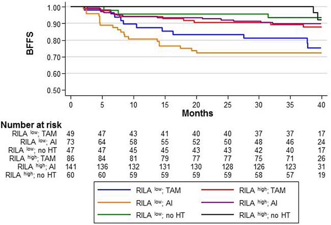 Figure 2: BFFS according to the RILA score (RILALOW or RILAHIGH) and the HT sub-categories: “TAM/no TAM”, “AI/no AI”, and “no HT”.