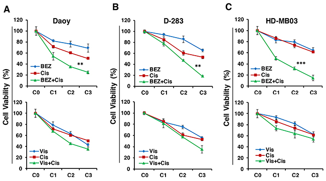 Figure 4: Effects of inhibitors in combination with chemotherapy on MB cell growth. MTT results showing the effects of Vis or BEZ individually or combined with Cis in Daoy (A), D-283 (B) and HD-MB03 (C) MB cell lines for 72 hours in a dose-dependent manner. The inhibitors concentrations C0, C1, C2 and C3 indicate increasing 0, 5, 10 and 20 μM/nM concentrations of Vis and BEZ, respectively. For Cis, C0, C1, C2 and C3 indicate their 0, 0.5, 1 and 1.5 μM concentrations. The values represent the means ± SD from four wells of 96-well plates. **p<0.01; ***p<001.