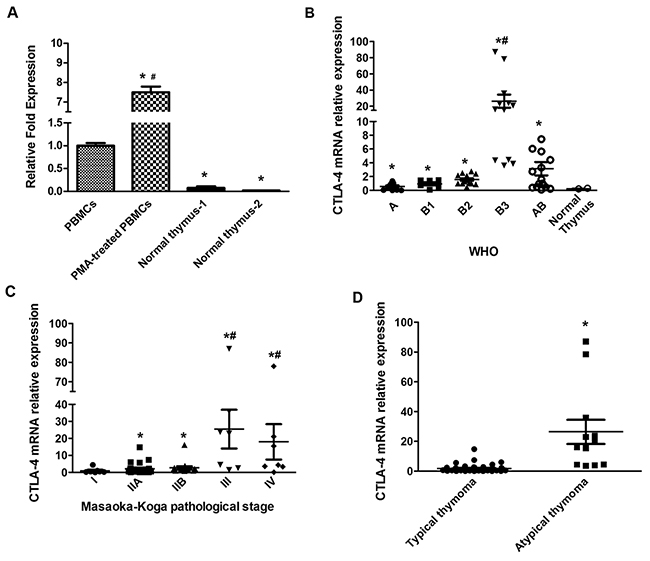 Figure 1: CTLA-4 expression on normal human thymus, lymphocytes and thymoma tissues. (A) CTLA-4 mRNA expression was evaluated by qRT-PCR in normal human thymus and PBMCs treated or not with PMA. CTLA-4 mRNA levels were normalized for GAPDH expression. Data are expressed as fold mean ± SD. *p<0.05 vs PBMCs, #p<0.05 vs PBMC, normal thymus -1 and normal thymus -2. (B) CTLA-4 mRNA expression levels distribution according to WHO classification; statistical analysis was performed using non-parametric Kruskal-Wallis with Dunn’s multiple comparisons test. Data are expressed as fold mean ± SD, *p<0.05 vs normal thymus-2; #p<0.05 vs A, B1, B2 and AB. (C) CTLA-4 mRNA expression levels distribution according to Masaoka-Koga classification; statistical analysis was performed by non-parametric Kruskal-Wallis with Dunn’s multiple comparisons test. Data are expressed as fold mean ± SD, *p<0.05 vs I, #p<.0.05 vs IIA or IIB. (D) CTLA-4 mRNA expression level distribution according to Moran and Suster classification; statistical analysis was performed using non-parametric Kruskal-Wallis with Dunn’s multiple comparisons test. Data are expressed as fold mean ± SD, *p<0.05 typical vs atypical thymomas.
