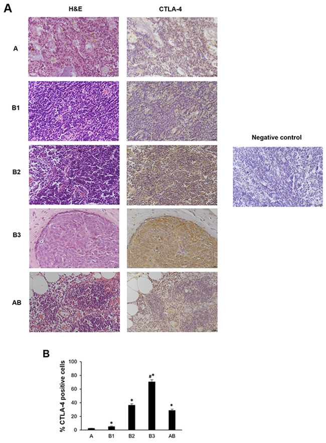 Figure 2: CTLA-4 protein expression in different subtypes of thymoma tissues. (A) Sections of A, B1, B2, B3 and AB thymomas A were processed for hematoxylin and eosin staining (right column) and for CTLA-4 (left column) by immunohistochemistry. Sections of thymoma B1 thymomas processed for immunohistochemistry without incubation of primary antibody, were used as negative control. Calibration bar: 25 μm. (B) The percentage of CTLA-4 positively stained cells was determined in all samples according to the staining intensity by the NIS Software. Data represents the mean ± SD. *p<0.05 vs A; #p<0.05 vs B1, B2 and AB.