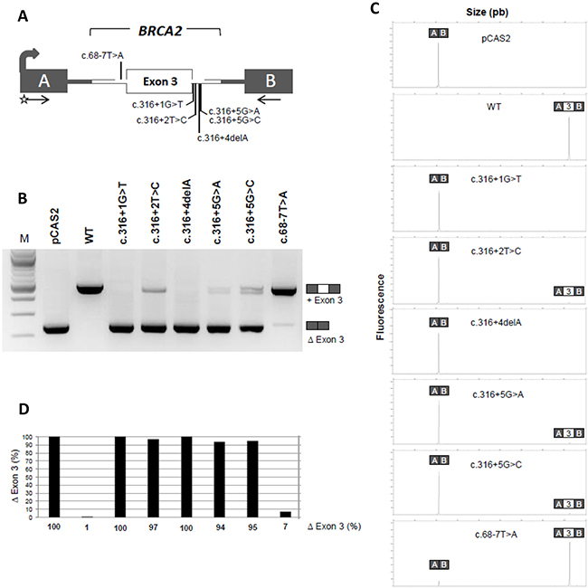 Figure 1: A minigene splicing assay confirms that variants located at the 5’ splice site of BRCA2 exon 3 induce drastic exon skipping. (A) Structure of the pCAS2-BRCA2-exon 3 minigene used in the minigene splicing assay. The grey arrow indicates the CMV promoter, boxes represent exons, lines in between indicate introns, and arrows under the exons represent primers used in RT-PCR reactions. The positions of the variants analyzed in the minigene assay are also indicated. The minigenes were generated by inserting a genomic fragment containing BRCA2 exon 3 and part of flanking intronic sequences into the intron of pCAS2 (either by using the proband’s gDNA as template or by introducing the variants into the minigenes by site-directed mutagenesis). WT and mutant constructs, as indicated, were then transfected into HeLa cells and the minigene transcripts were analyzed by RT-PCR, as described in Materials and Methods. (B) Analysis of the splicing pattern of the pCAS2-BRCA2-exon 3 minigenes carrying the variants of interest. BRCA2 c.68-7T>A was used as control. The image shows the results of a representative experiment, in which the RT-PCR products were separated on a 2.5% agarose gel stained with ethidium bromide and visualized by exposure to ultraviolet light. M, size marker (100 bp DNA ladder, New England Biolabs). The identities of the two major RT-PCR products, with or without exon 3, are indicated on the right. (C) Representative results from fluorescent RT-PCR reactions (equivalent to those shown in B) performed by using a fluorescent forward primer and then separated under denaturing conditions by capillary electrophoresis on an automated sequencer. The identities of the RT-PCR products are shown above the peaks. (D) Level of exon 3 skipping observed in the minigene assay as determined by fluorescent RT-PCR (variants displayed in the same order as in B). Results are shown as the average of three independent experiments and are expressed as percentage of exon skipping (exon skipping product x 100/total transcripts).