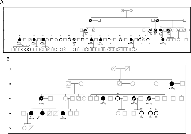 Figure 3: Pedigrees of families with BRCA2 c. 316+5G>C (A) and c.156_157insAlu (B) variants. Circles indicate females and squares indicate males, in bold relatives with mutated genetic status known but not affected. Slashes indicate death. The proband is indicated by an arrow. Current ages or age at death and age at cancer diagnosis are listed below each individual, together with genetic status when known.