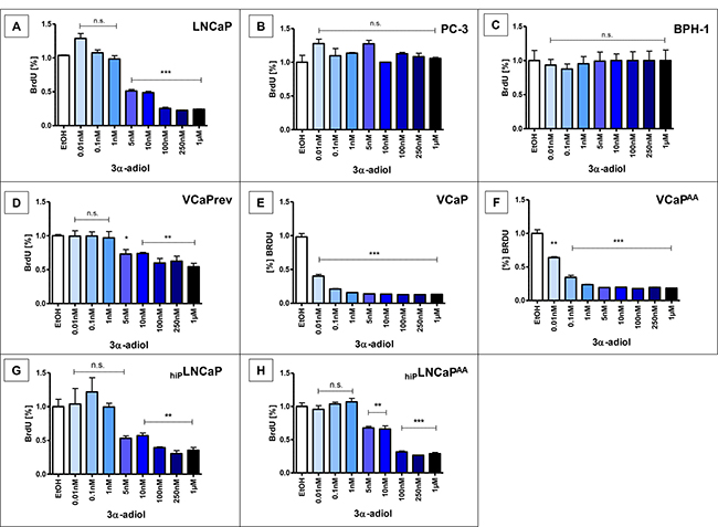 Figure 1: Proliferation after treatment with 3α-adiol. Several prostate cancer cell lines were treated with 0, 0.01, 0.1, 1, 5, 10, 100, 250, or 1000 nmol/L 3α-adiol. Proliferation was assessed by performing BrdU-ELISA. 3α-adiol led to a significant reduction in proliferation in various LNCaP- and VCaP-derived cell lines, whereas androgen receptor (AR)-negative PC-3 and non-neoplastic BPH-1 cells showed no changes in proliferation (n.s. = not significant, *P < 0.05, **P < 0.005, ***P < 0.0005).