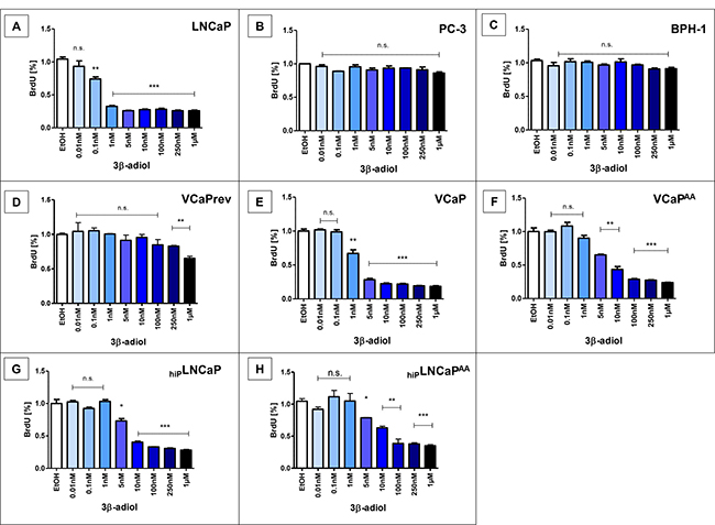Figure 2: Proliferation after application of 3β-adiol. Several prostate cancer cell lines were treated with 0, 0.01, 0.1, 1, 5, 10, 100, 250, or 1 nmol/L 3α-adiol. Proliferation was assessed by performing BrdU-ELISA. 3β-adiol led to a significant reduction in proliferation in LNCaP and VCaP derivatives, whereas PC-3 and BPH-1 showed no changes in proliferation (n.s. = not significant, *P < 0.05, **P < 0.005, ***P < 0.0005).