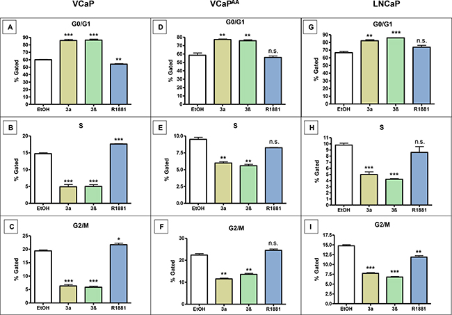 Figure 3: Cell cycle changes in various CRPC-cells after the application of 3α-adiol, 3β-adiol, and R1881. Prostate cancer cell lines were treated with 1 μmol/L 3α-adiol, 1 μmol/L 3β-adiol or 10 nmol/L R1881. Cell cycle was assessed using the commercial Muse™ Cell Cycle assay kit. In VCaP and VCaPAA cells, 3a-, 3β-adiol significantly increased cell numbers in the G0/G1 phases, whereas cells in the S or G2/M phases were significantly reduced. R1881 showed an opposite effect with a reduced number of cells in the G0/G1 phases and increased number of cells in the S and G2/M phases. In VCapAA cells, no significant changes were detected (A–F). In LNCAP 3a- and 3β-adiol application led to increases in cells in the G0/G1 phases, whereas the number of cells in S and G2/M phases was significantly reduced. R1881 resulted in inconsistent changes (G–I) (n.s. = not significant, *P < 0.05, **P < 0.005, ***P < 0.0005).