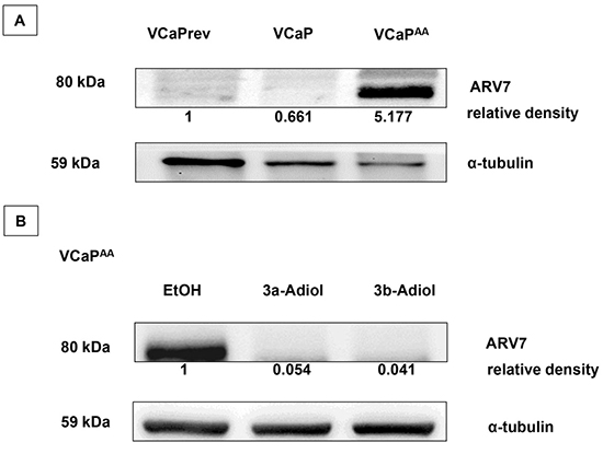 Figure 5: ARV7 expression in VCaP under increasing androgen deprivation. With increasing androgen deprivation therapy (ADT), the expression of full-length androgen receptor (flAR) continuously increased (as shown in Figure 4A–4C), which was accompanied by a stepwise increase in specific antibody staining for the AR splice variant 7 (ARV7), but only with maximum ADT (A). The strong ARV7 signal in the presence of abiraterone acetate was reversible upon additional treatments of VCaP AA cells with 1 μmol/L 3α-adiol or 3β-adiol (B).