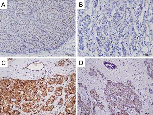 A total of 214 women treated for Stage I to III breast cancer between 2004 and 2010 at Hokkaido University Hospital were recruited to this study (Table 1). The study protocol was approved by the institutional review board and conformed to the guidelines of the 1996 Declaration of Helsinki. Written informed consent for the use of surgically resected tumor tissues was provided by all patients prior to treatments. The samples were chosen from a continuous series of ER-positive, HER2-negative invasive ductal carcinoma of the breast. All patients had undergone mastectomy or lumpectomy. Tumor samples were obtained during surgery. Patients received adequate endocrine or chemotherapy as adjuvant therapy. Patients treated with neoadjuvant chemotherapy were excluded. Patients received adjuvant endocrine therapy (tamoxifen ± luteinizing hormone-releasing hormone agonist for premenopausal women and aromatase inhibitors for postmenopausal women), and patients who had positive results of axillary lymph node dissection received adjuvant chemotherapy including anthracyclines and/or taxanes, as well as adjuvant endocrine therapy.
