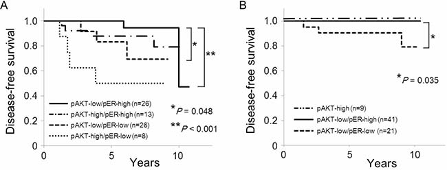 Figure 3: Kaplan–Meir curves of the effect of phosphorylation of AKT Ser473 and ERα Ser167 by PIK3CA mutation status on disease-free survival in postmenopausal women. (A) Disease-free survival according to phosphorylation status of AKT Ser473 and ERα Ser167 in PIK3CA wild-type tumors. (B) Disease-free survival according to phosphorylation status of AKT Ser473 and ERα Ser167 in PIK3CA mutant tumors.