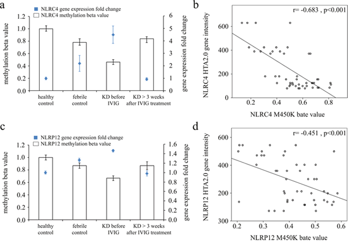 In this study, we analyzed the DNA methylation levels of NLRs in 18 KD patients, before treatment and after at least 3 weeks from receiving intravenous immunoglobulin (IVIG), and in 36 healthy (non-fever) controls by Illumina HumanMethylation 450 BeadChip and Affymetrix GeneChip® Human Transcriptome Array 2.0. Subsequently, we validated the mRNA levels of NLRs in 43 KD patients and 35 febrile subjects by real-time quantitative PCR (Table 2). KD patients met the American Heart Association’s diagnosis criteria for KD, which is characterized by extended fever for more than five days, conjunctivitis, diffuse mucosal inflammation, polymorphous skin rashes, indurative edema of the hands and feet associated with peeling of the finger tips in the subacute stage, and non-suppurative lymphadenopathy [40, 41], and treated with once dose of high-dose IVIG treatment (2 g/kg) over 12 h at our hospital. The patients in the fever control group had diagnoses of acute tonsillitis, croup, acute bronchitis, bronchopneumonia, acute sinusitis, or urinary tract infection. We took peripheral blood samples from KD patients prior to undergoing IVIG treatment (pre-IVIG) and then at least three weeks after completing the IVIG treatment, as previously described in another of our studies [42]. A CAL was defined as a coronary artery with an internal diameter of at least 3 mm (4 mm if the patient was older than 5 years) or a segment with an internal diameter at least 1.5 times larger than that of an adjacent segment, as observed through echocardiography [43, 44]. This study was approved by the Chang Gung Memorial Hospital’s Institutional Review Board (IRB No.:101-4618A3), and we obtained written informed consent from the parents or guardians of all subjects. All of the methods that we used complied with the relevant guidelines established.