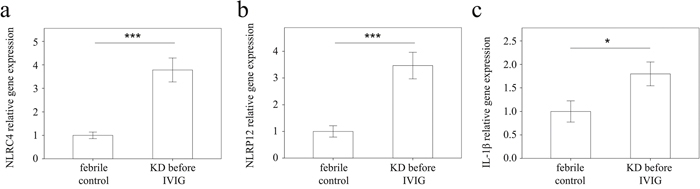 Figure 3: Analyses of (a) NLRC4, (b) NLRP12, and (c) IL-1β mRNA in the peripheral blood mononuclear cells of KD patients (n = 43) and controls (n = 35) using a real-time quantitative polymerase chain reaction. Data are expressed as mean ±standard error. *indicates p < 0.05 and ***indicates p < 0.001 between the groups.