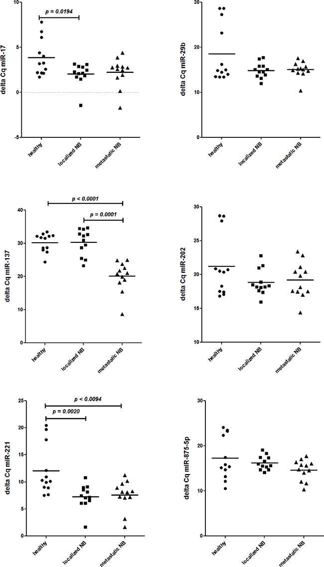 Thus, the miRNA expression profiles of all children with NB were compared with those of healthy children. Also in this case no significant (Bonferroni’s adjusted p value) difference was found. Therefore, to identify miRNAs potentially over-expressed in BM resident cells from children with NB, as compared with healthy children, we ranked miRNAs according to the increased fold change (Table 2). To select miRNAs whose over-expression could be biologically relevant in regulating gene expression we considered only the six-top-ranked miRNAs with a fold increase over 150 fold (0.015 in Table 2). The expression of the six top-ranked miRNAs was then evaluated by specific RT-qPCR in all the samples. As shown in Figure 1, miR-29b, miR-202 and miR-875-5p were found expressed at similar levels in children with localized or metastatic NB and healthy children. MiR-17 was over-expressed in children with localized NB and miR-137 was significantly over-expressed in children with metastatic NB (Figure 1). Thus, only miR-221 was significantly over-expressed by BM resident cells from children with NB regardless of localized or metastatic disease (Figure 1).