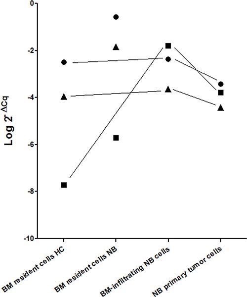Three miRNAs, namely miR-17, miR-137 and miR-221, were over-expressed by BM resident cells from children with NB, as compared with healthy children. However, miR-17 was over-expressed only in children with localized NB and miR-137 only in children with metastatic NB. Whereas high level of miR-137 were likely due to close contact between BM-infiltrating NB cells and BM resident cells, the increased expression of miR-17 and miR-221 was unlikely to be a consequence of a transfer from NB primary tumor cells, because the levels in NB cells were similar to that of BM resident cells from healthy children.