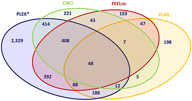 The comprehensive lncRNA prediction analysis revealed that the classification of unknown transcripts is dependent on the specific bioinformatic tool applied (Table 1). It is striking that PLEK classified nearly all transcripts included in the input dataset of unknown transcripts (98%) compared to the other three tools (21%, 32% and 33% for PLAR, FEELnc and CNCI), which is due to the fact that monoexonic transcripts were not filtered out when applying PLEK. Thus, PLEK predicted the highest number of lncRNA transcripts to be present in the dataset of unknown transcripts. It is further noticeable that FEELnc and CNCI classified a similar number of putative lncRNA and novel mRNA transcripts, whereas PLAR resulted in the lowest number transcripts classified from the dataset of unknown transcripts (Table 1). The particularly remarkable low number of putative novel mRNA transcripts identified by PLAR could be due to the very stringent filtering parameters applied in this prediction algorithm.