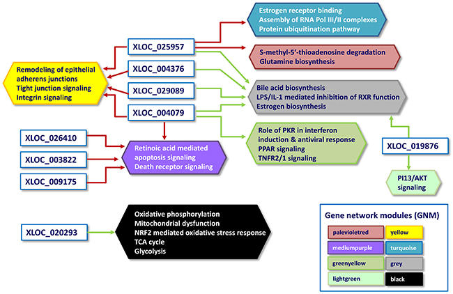 To identify putative lncRNA-related biological pathways and to predict the functional roles of differentially expressed lncRNAs, we performed enrichment, pathway and network analyses using the Ingenuity analysis package (IPA, https://www.qiagenbioinformatics.com/products/ingenuity-pathway-analysis/). Therefore, genes from significantly correlated GNM identified previously by WGCNA were used as input for the IPA analysis. All annotated protein-coding genes of a GNM were included in the analysis, unannotated loci were discarded. We manually edited gene names of those transcripts only annotated with Ensembl annotation ID numbers according to the Ensembl Bos taurus annotation release 90 and NCBI Bos taurus annotation release 105.