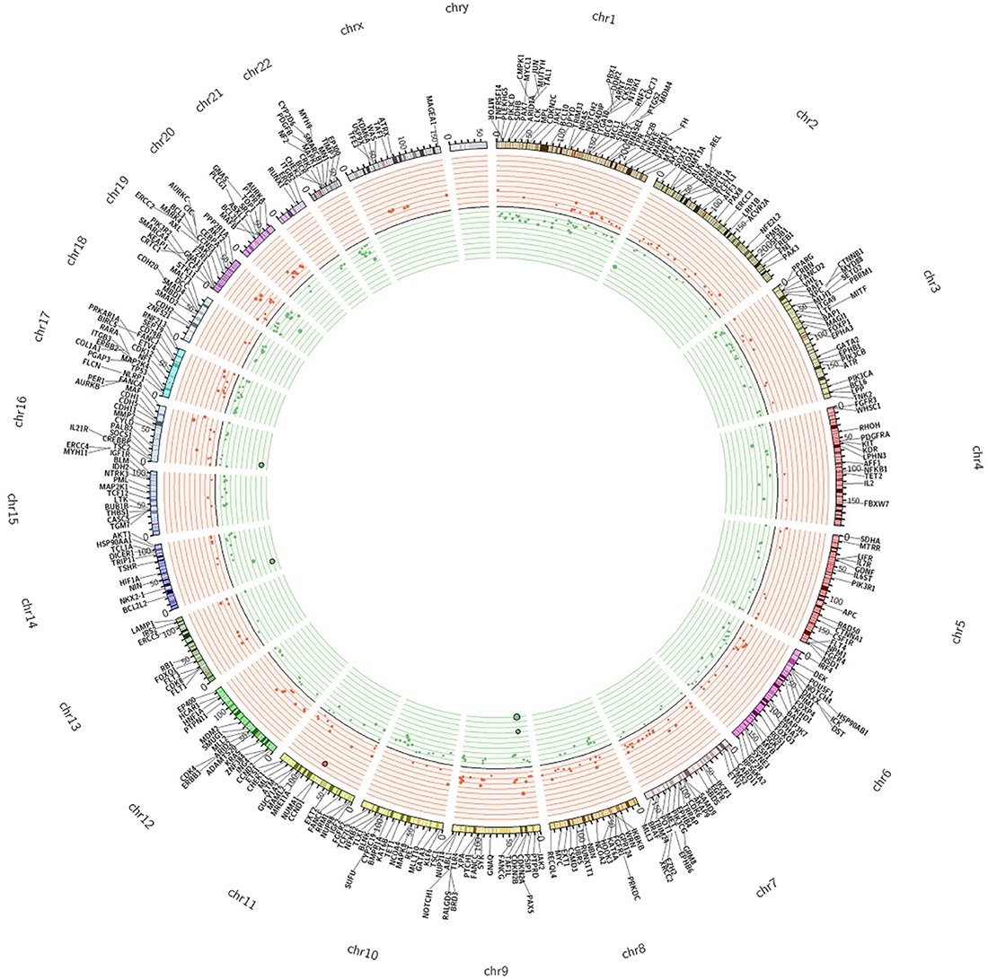 Figure 2: The Circos plot summarizes all CNAs detected in colon cancers samples under analysis. The two outermost tracks report the distributions of 409 genes along the genome; the innermost tracks reported the values of the log2 CN ratio. Genes with altered CN are distinguished by colour as deletions (green) and amplifications (red).