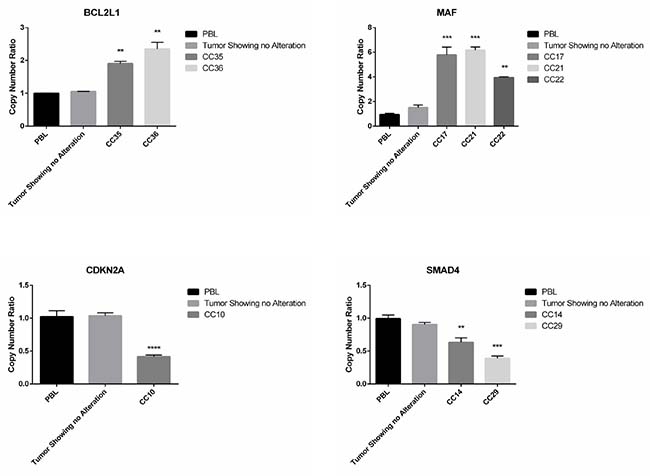 Figure 4: Q-PCR analysis of samples presenting CNAs in SMAD4, CDKN2A, MAF and BCL2L1. Q-RT-PCR analysis of CN losses in SMAD4 and CDKN2A and of CN gains in MAF and BCL2L1. Values are expressed as CN ratio using as standard the median value of 3 PBL samples set as 1. Tumors presenting normal CN for the specific genes were also included in each experiment. Statistical significance as indicated when confronted with PBL.