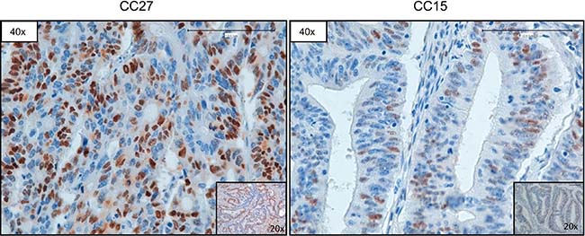 Figure 5: Representative images of CCND1 immunostaining. Sample CC27 (with CN gain of CCND1) and sample CC15 (with normal CN of CCND1), respectively. Magnification as indicated.
