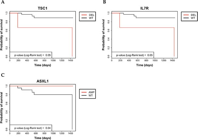 Patients with CN loss in TSC1 (2 dead patients out of 3) showed mean survival of 34 months whereas patients with no TSC1 alterations (3 dead patients out of 33) showed mean survival of 45 months. Patients with CN loss in IL7R (2 dead patients out of 3) showed mean survival time of 34 months in comparison with patients showing normal genetic status of IL7R, mean survival of 45 months (3 dead patients out of 33).