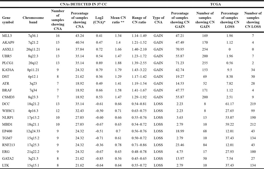 Previous studies of CNAs detection in CC were carried out by quantitative PCR, fluorescence in situ hybridization (FISH), whole-genome array comparative genomic hybridization (aCGH) or single-nucleotide polymorphism (SNP) arrays [47–49]. The recent advent of high-throughput sequencing techniques and the subsequent development of ad hoc algorithms have made available CNAs identification [50, 51]. Recently, Grasso and co-workers have developed an algorithm for assessing CNAs from Next Generation Sequencing (NGS) data generated by amplicon-based DNA libraries derived from Formalin Fixed Paraffin-Embedded (FFPE) tumors [52].