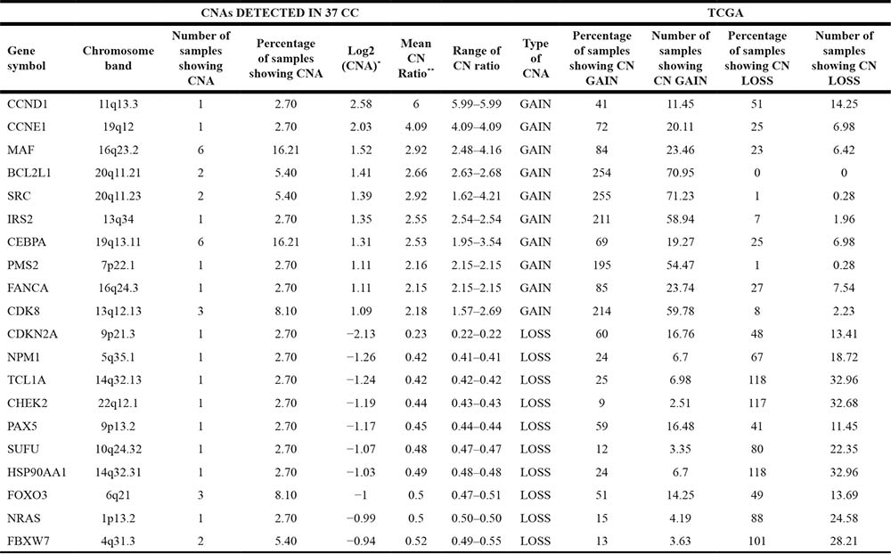 In Table 2 are listed the genes with the highest values of CN changes (columns 1–8). Among these, there were CCND1 with a mean CN ratio of 6.0, CCNE1 with a mean CN ratio of 4, MAF with a mean CN ratio of 3.30, BCL2L1 with a mean CN ratio of 2.19 and CDKN2A with a mean CN ratio of 0.2.