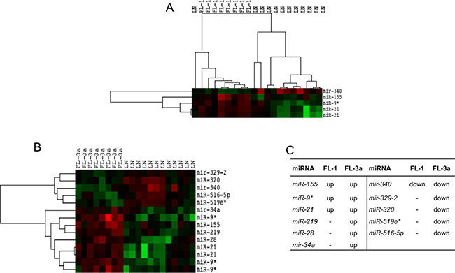 Figure 2: Profile of miRNAs differentially expressed between FL grade 1 or 3a and rLNs. FL-1 and FL-3a are follicular lymphoma (FL) of grade 1 and 3a, respectively. Red, higher expression (log2, +4); green, lower expression (log2, –4). (A) The heat maps describe the expression of 14 spots, corresponding to 11 single miRNAs, differentially expressed in 20 samples: eight FLs grade 1 and 12 reactive lymph nodes (rLNs) (FDR 10%). (B) The heat maps describe the expression of 5 spots, corresponding to 4 single miRNAs, differentially expressed among 20 samples: eight FLs grade 3a and 12 rLNs (FDR 10%). (C) The table reports the list of 11 miRNAs upregulated (up) or downregulated (down) in FL grade 1 and 3a in comparison to rLNs.
