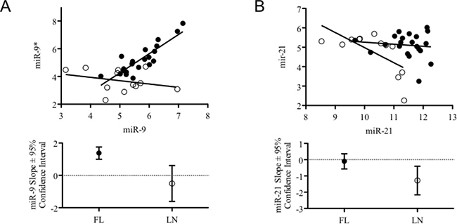 Figure 3: Combined expression levels and trend of 5p and 3p variants of miR-9-2 and miR-21 in FLs and rLNs. (A) Graph reports the expression level of miR-9-2 and miR-9* (from microarray data) in 21 follicular lymphomas (FLs) cases having clinical information (black circles) and in 12 reactive lymph nodes (rLNs) (empty circles). (B) Graph reports the expression level of miR-21 and miR-21* (from microarray data) in 21 FLs cases having clinical information (black circles) and in 12 rLNs (empty circles). Bottom graphs report slope and 95% confidence interval of the trend lines passing through the symbols of the two series represented in top graphs.