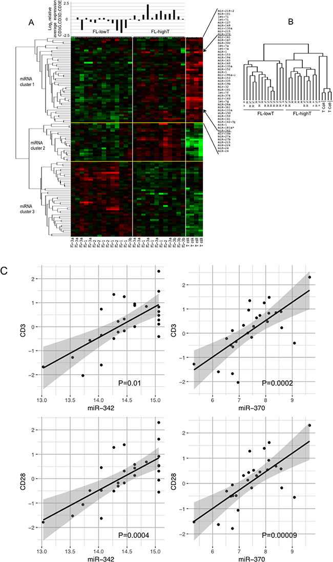 Figure 4: Profile of miRNAs differentially expressed among FLs, CD4+ T-cells and CD8+ T-cells. FL-HT, follicular lymphoma (FL) with high T-cell level. FL-LT, with low T-cell level. (A) The heat map describes the expression levels of miRNAs differentially expressed among 30 samples: 26 FLs, two CD4+ and two CD8+ T-cell samples (FDR 1%). FL-1, FL-2, FL-3a, FL-3b are FLs of grade 1, 2, 3a and 3b, respectively. Red, higher expression (log2, +4); green, lower expression (log2, -4). On the right of the heat map a partial list of miRNA differentially expressed among the three sets of samples, which are expressed at higher level in T-cells than in FLs (miRNA cluster 1). On the top of the heat map is the average mRNA expression level of three CD3 chains gamma, delta and epsilon for each of the 26 FL samples. Expression data were obtained by qRT-PCR. (B) Array tree of 30 samples based on the expression levels of miRNAs differentially expressed. (C) Correlation between the expression levels of miR-342 or miR-370 (from microrray analysis) and the expression level (log2) of CD3 and CD28 mRNAs by qRT-PCR in 26 FLs samples. P was calculated by Spearman’s correlation.