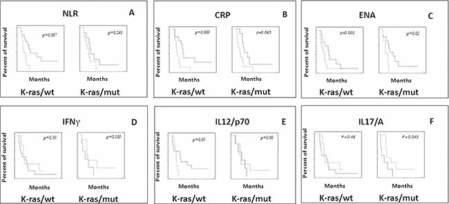 Figure 3: Evaluation of predictive markers in mCRC patients with k-ras/wt and k-ras/mut who received TSPP vaccine. Different influence of baseline levels of NLR (A), CRP (B), ENA (C), IFNγ (D), IL12/p70 (E) and IL17/A (F) on k-ras wt and k-ras mut patients treated with TSPP vaccine. Overall survival was compared between the two groups of patients with baseline levels < and ≥ the median value of each specific parameter. Asterisk (*) represents statistical significance between the arms (P < 0.05).