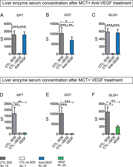 Figure 4: Liver enzyme serum concentration after MCT+ Anti-VEGF/VEGF treatment. Results from group Anti-VEGF 1&2 plus VEGF 1&2; Animals were treated with MCT and additionally received Anti-VEGF (A–C) or VEGF (D–F). Blood samples and liver tissue were collected after 96h and examined. Results from group Anti-VEGF 1 and 2 are combined provided (A–C); Results from group VEGF 1 and 2 are combined provided; (A) GOT serum concentration after Anti-VEGF treatment; (B) GPT serum concentration after Anti-VEGF treatment; (C) GLDH serum concentration after Anti-VEGF treatment; (D) GOT serum concentration after VEGF treatment; (E) GPT serum concentration after VEGF treatment; (F) GLDH serum concentration after VEGF treatment; Major significances are shown; *p < 0,05; **p < 0,005; ***p < 0,001 (CTL SOS: control animals treated with MCT and PBS developing SOS; CTL: nSOS: control animals treated with MCT and PBS developing no SOS; Anti-VEGF: animals treated with MCT and Anti-VEGF; VEGF: animals treated with MCT and VEGF).