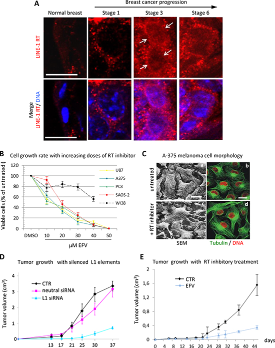 Compelling evidence indicate that retrotransposition events exert a profound impact on genome function and expression, with a crucial role of the endogenous RT. LINE-1-encoded RT is an essential mechanistic component for the mobility of retrotransposons, usually not thought to play any other role beyond retrotransposition. Intrigued by the evidence implicating retrotransposition in the physiological state of cells and tissues, we sought to directly assess the role of RT in tumorigenesis using two experimental approaches. In the first one, RT was pharmacologically inhibited in cancer cell lines using nonnucleoside inhibitors widely employed in AIDS treatment, e.g. nevirapine or efavirenz (EFV) [76,77,78]; in the second one, we used the RNA interference (RNAi) methodology to down-regulate the expression of full-length RT-encoding LINE-1 elements, the major source of RT activity in human cells [4], in cancer cell lines [78,79]. Both approaches yielded consistent responses: first, RT inhibition caused a reduced cell proliferation rate in cancer cells transformed but not in normal cells (e.g. WI38 fibroblasts) (Fig. 1B); second, cells assumed a differentiated phenotype (exemplifying panels from A375 melanoma cultures are depicted in Fig.1C). The changes in cell functional morphology (such as seen in Fig. 1C), including the appearance of dendritic-like extensions and increased adhesion to the plate surface, distinctive of differentiating melanoma (see [78] for an in-depth characterization), are accompanied by global alterations of the transcriptome of coding and non-coding sequences, as will be seen below. Several laboratories have independently confirmed these conclusions in studies of various human tumorigenic cell lines treated with RT inhibitors, both of the nonnucleoside [80,81, 82] and the nucleoside type [83, 84, 85].