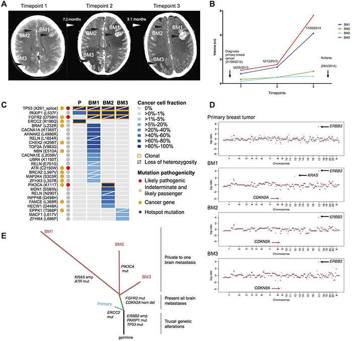 Figure 1: The somatic genetic alterations in the primary breast tumor and the three synchronous, spatially distinct brain metastatic lesions of the index case. (A) Longitudinal representation of computer tomography scans, showing coronal sections in T1W1 and the presence of 3 main lesions: BM1, left frontal lobe, BM2, basilar ganglion, BM3, right occipital lobe during the timepoint 1 (06.05.2013), timepoint 2 (12.12.2013) and timepoint 3 (17.03.2014). (B) Bar graphs representing the volumes of main brain lesions that were followed up in the clinics. Note that two small lesions in the basilar ganglion (BM2) were followed up in the clinical care of this patient. (C) Heatmap depicting the cancer cell fractions (CCF) of the mutations as defined by ABSOLUTE [11] in the primary breast cancer and the metachronous brain metastases. Color key for CCF is depicted. Red and orange dots indicate likely pathogenic mutations and mutations affecting cancer genes [12–14], respectively. Asterisk (*) indicate hotspot mutation [17]. The presence of loss of heterozygosity is represented by a diagonal bar, and clonal mutations are indicated by an orange box. (D) Genome plots of the primary tumor and the three brain metastatic lesions highlighting ERBB2 gene amplification, KRAS amplification and CDKN2A homozygous deletion. Smoothed Log2 ratios were plotted on the y-axis according to their genomic positions indicated on the x-axis. (E) Phylogenetic tree constructed from the somatic mutations, amplifications and homozygous deletions highlighting the main genetic alterations for each sample sequenced. The branch lengths are proportional to the number of genetic alterations.