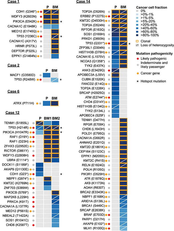 Figure 2: The repertoire of somatic genetic alterations in primary breast cancers and their respective brain metastases. Heatmap depicting the cancer cell fractions (CCF) of the mutations as defined by ABSOLUTE [11] in the primary breast tumors and the metachronous brain metastases. CCFs are depicted according to the color key. Red and orange dots indicate likely pathogenic mutations and mutations affecting cancer genes [12–14], respectively. Asterisks (*) indicate hotspot mutations [17]. The presence of loss of heterozygosity (LOH) of the wild-type allele is represented by a diagonal bar, and mutations considered clonal by ABSOLUTE [11] are indicated by an orange box.