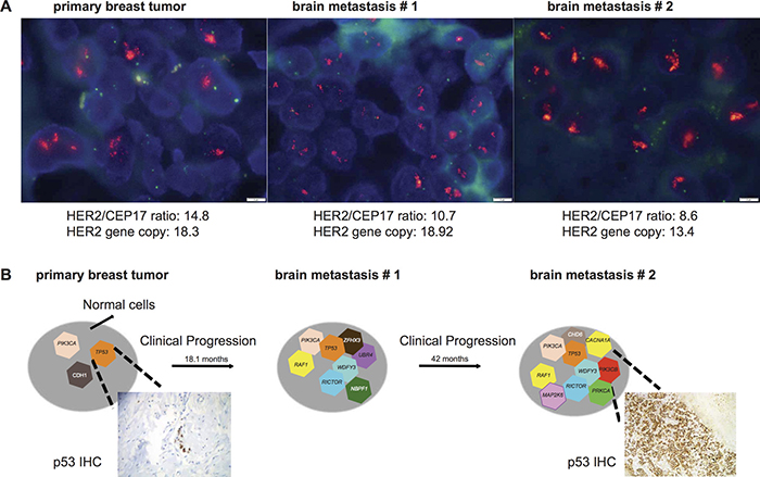 Figure 3: Progression and associated shift in clonal composition of Case 12. (A) Fluorescent in situ hybridization representative micrographs characterize the HER2 status of the primary breast cancer, brain metastasis #1, brain metastasis #2 as HER2-amplified. HER2/CEP17 ratio and HER2 gene copy number are shown for each sample. Scale bar: 5 microns. (B) Schematic shows shifts in clonal composition from the diagnosis of primary breast cancer to the development of two sequential brain metastases over a period of 60.8 months. Genes affected by likely pathogenic mutations are illustrated. P53 expression has a focal pattern in the primary tumor and is enriched in the brain metastasis (more than 80% of the cells) as depicted in the representative micrograph of immunohistochemistry with antibodies against p53 (See Materials and Methods, original magnifications 100X).
