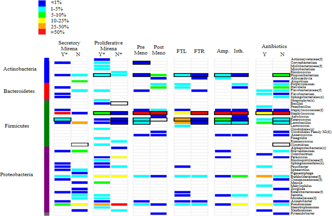 Figure 1: Heat map depicting the most abundant taxa identified in microbial communities found in human fallopian tubes. The heat map demonstrates the relative abundance of each community member in the fallopian tube sample. Samples are paired according to menstrual cycle phase, the use of exogenous hormones, anatomical location and pre-surgical antibiotic usage. Each microbial taxon identified for the sample is represented by a coloured bar, the colour of which represents the relative abundance of a given taxon compared to all other taxa identified in that sample. Black rectangles around the coloured bars indicate that specific taxa were also identified from the samples using cultivation-dependent techniques. Y = yes, N = no, meno = menopause, FTL = left fallopian tube, FTR = right fallopian tube, Amp = ampulla, Isth = isthmus, (f) = family, (g) = genus
