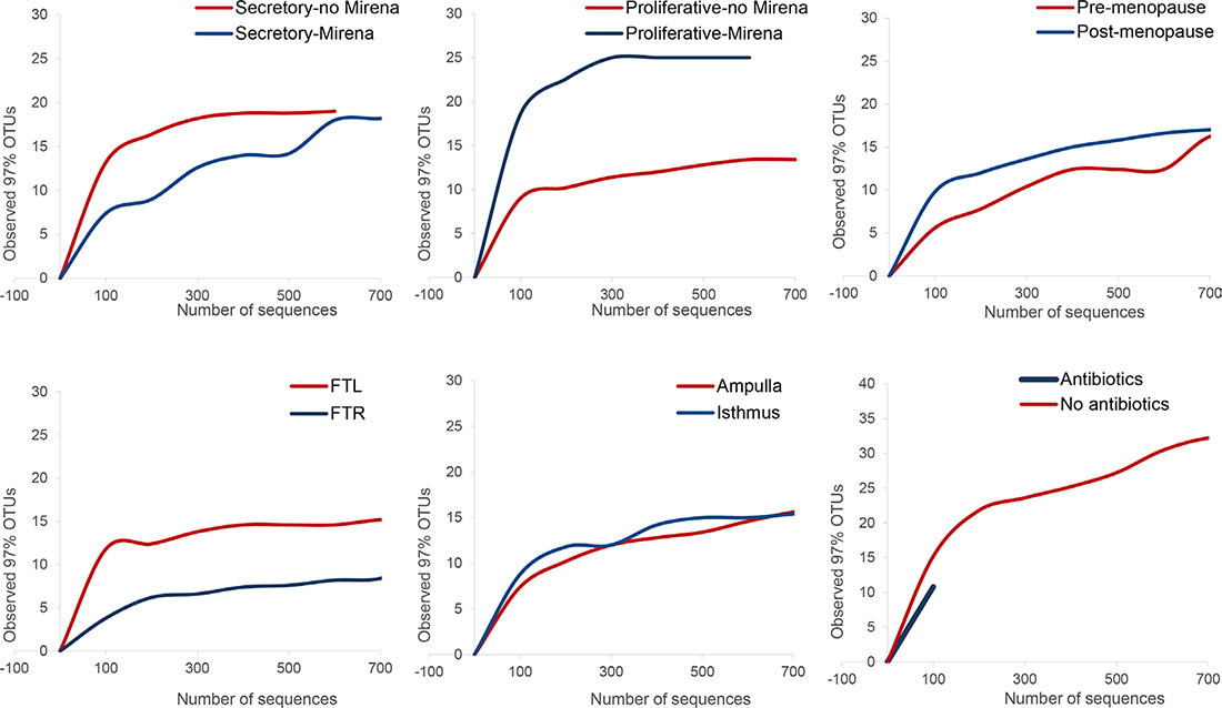Figure 2: Pairwise comparisons and rarefaction curves for community-level shifts in microbiota related to hormonal changes, anatomical differences and antibiotic usage prior to surgery. Rarefaction curves of OTUs clustered at 97% sequence identity across different fallopian samples demonstrate differences in taxonomic richness for cycling women in the presence and absence of exogenous progesterone, for anatomical location and for women who were and were not prescribed prophylactic antimicrobial the night prior to surgery. FTL = left fallopian tube, FTR = right fallopian tube
